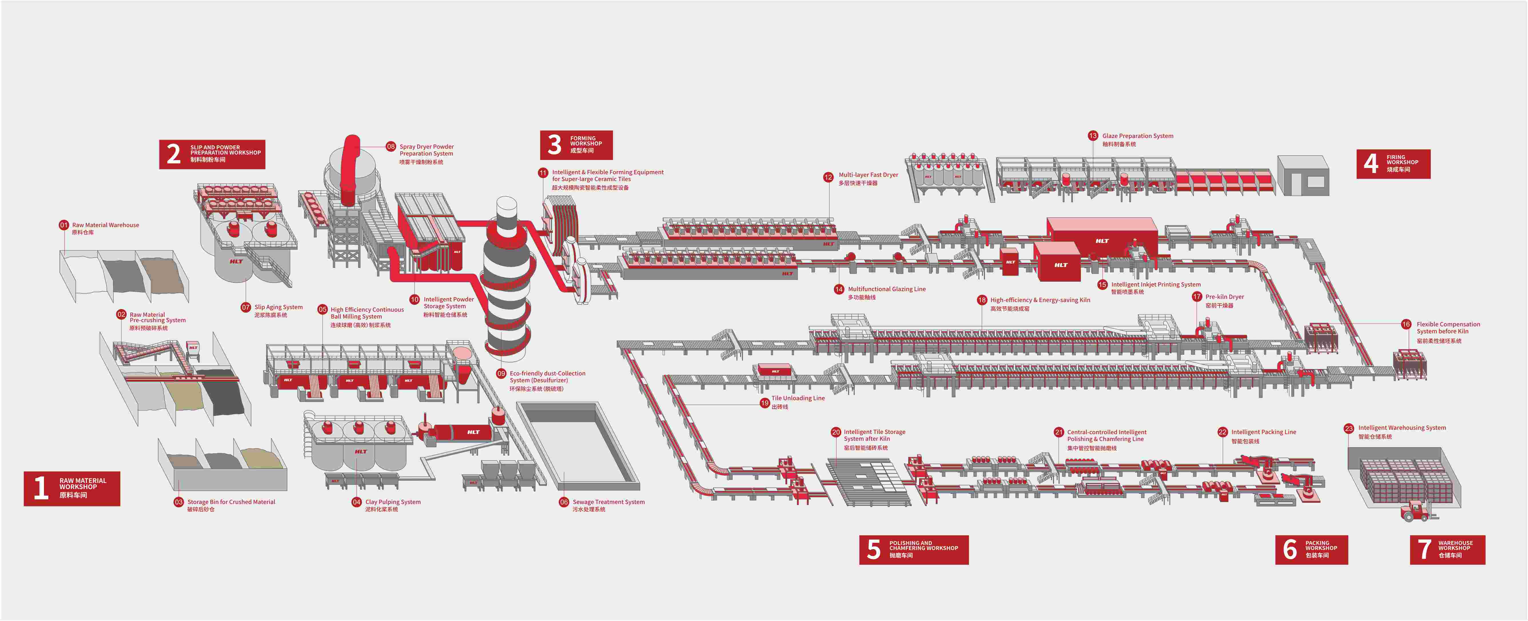 The complete line equipment for fired tiles, including the intelligent tile storage system, CNC intelligent polishing line, sorting and temporary storage system before packaging and intelligent storage system.