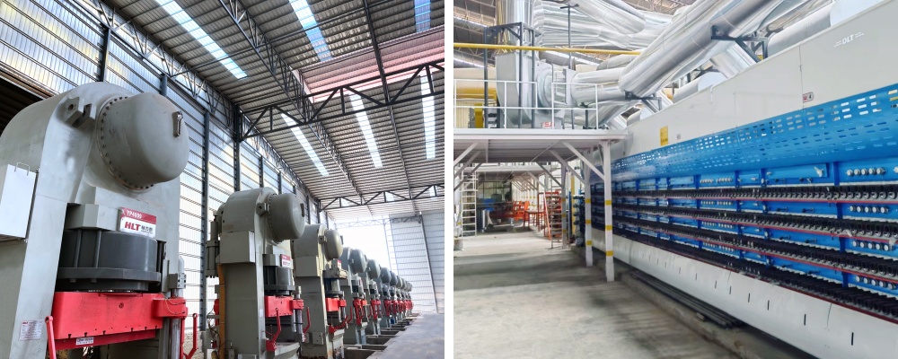 The production lines feature advanced machinery from HLT&DLT, including 2 YP4009 presses, 2 EM series high-efficiency self-circulating 4-layer dryers, 2 "4.0 Energy Efficiency Benchmark Smart Era" DFC firing kilns, and supporting auxiliary systems.