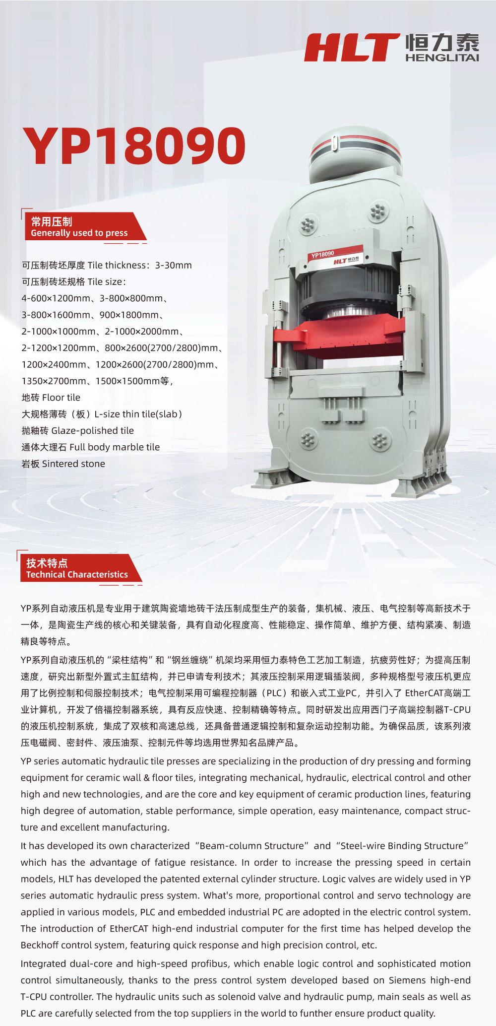 YP series automatic hydraulic tile presses are specializing in the production of dry pressing and forming equipment for ceramic wall & floor tiles, integrating mechanical, hydraulic, electrical control and other high and new technologies, and are the core and key equipment of ceramic production lines.