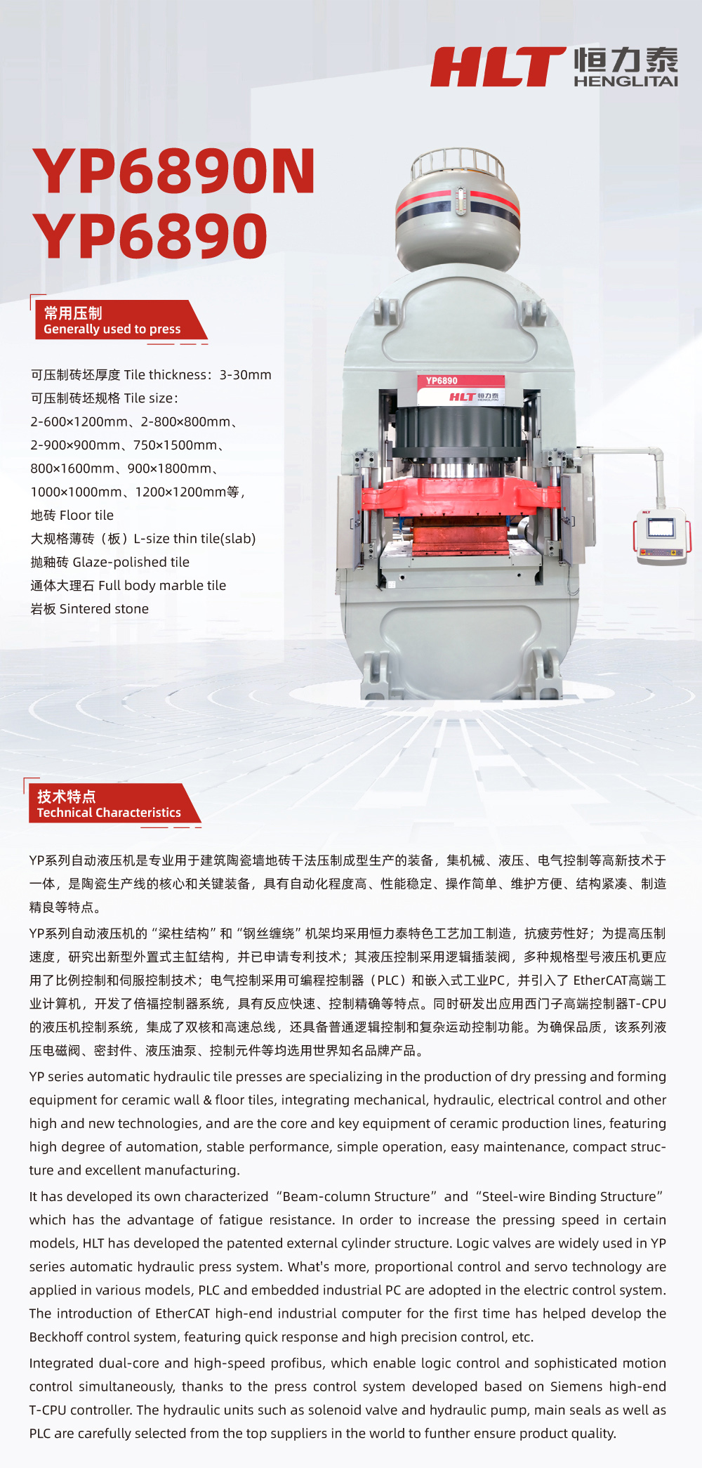 YP series automatic hydraulic tile presses are specializing in the production of dry pressing and forming equipment for ceramic wall & floor tiles, integrating mechanical, hydraulic, electrical control and other high and new technologies, and are the core and key equipment of ceramic production lines.