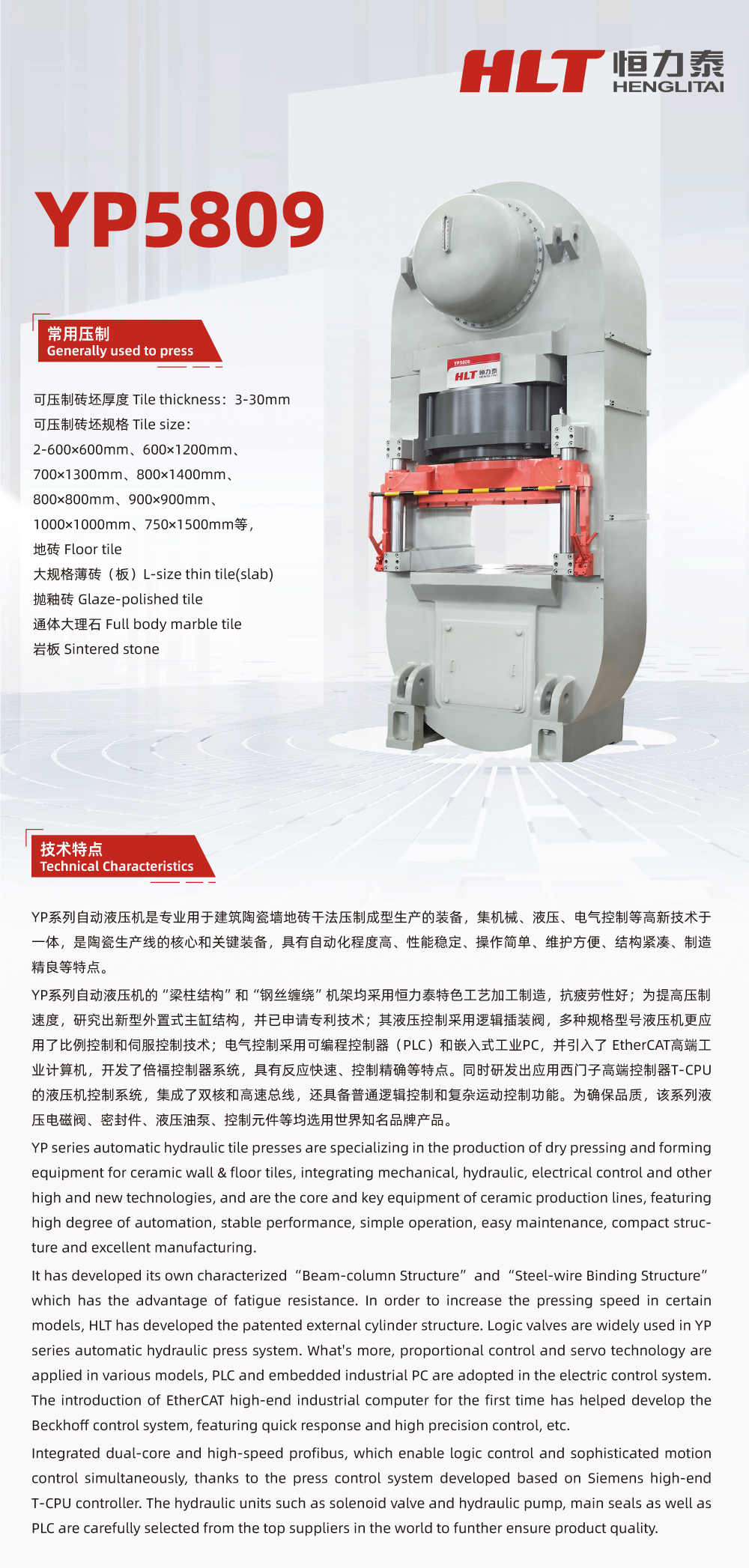 YP series automatic hydraulic tile presses are specializing in the production of dry pressing and forming equipment for ceramic wall & floor tiles, integrating mechanical, hydraulic, electrical control and other high and new technologies, and are the core and key equipment of ceramic production lines.