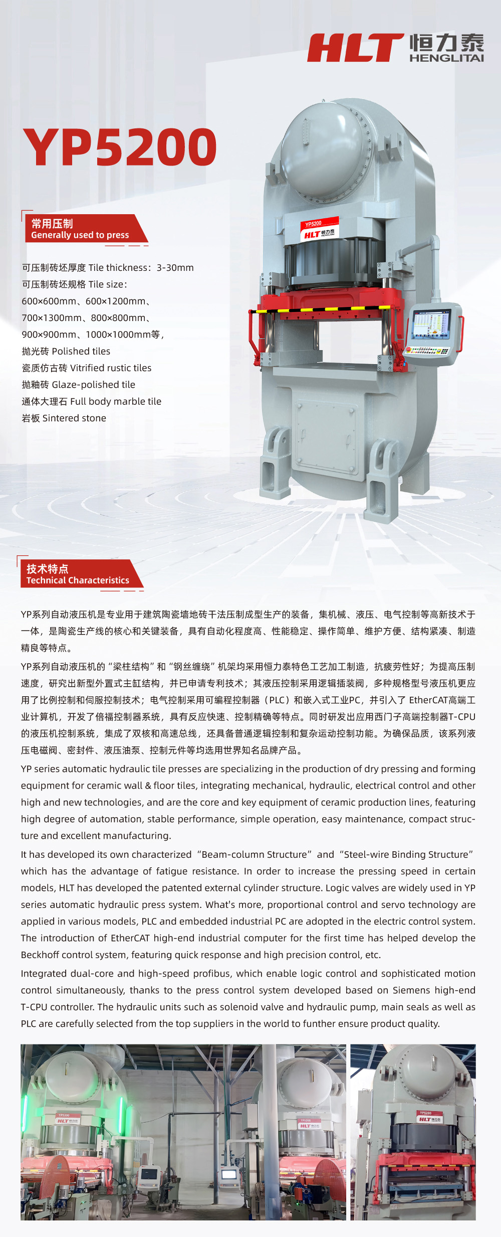 YP series automatic hydraulic tile presses are specializing in the production of dry pressing and forming equipment for ceramic wall & floor tiles, integrating mechanical, hydraulic, electrical control and other high and new technologies, and are the core and key equipment of ceramic production lines.