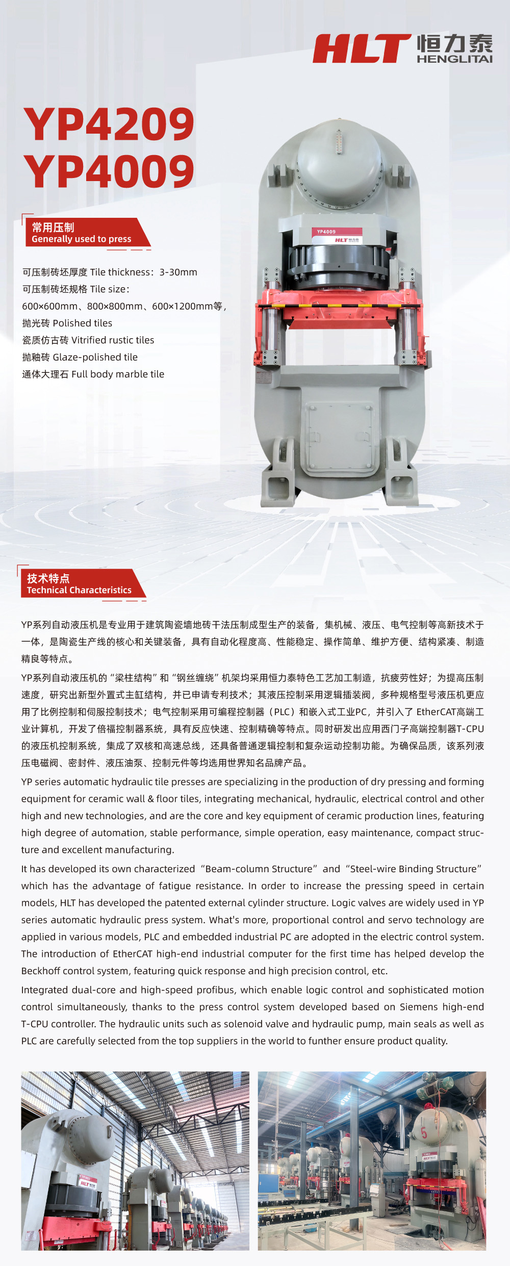 YP series automatic hydraulic tile presses are specializing in the production of dry pressing and forming equipment for ceramic wall & floor tiles, integrating mechanical, hydraulic, electrical control and other high and new technologies, and are the core and key equipment of ceramic production lines.