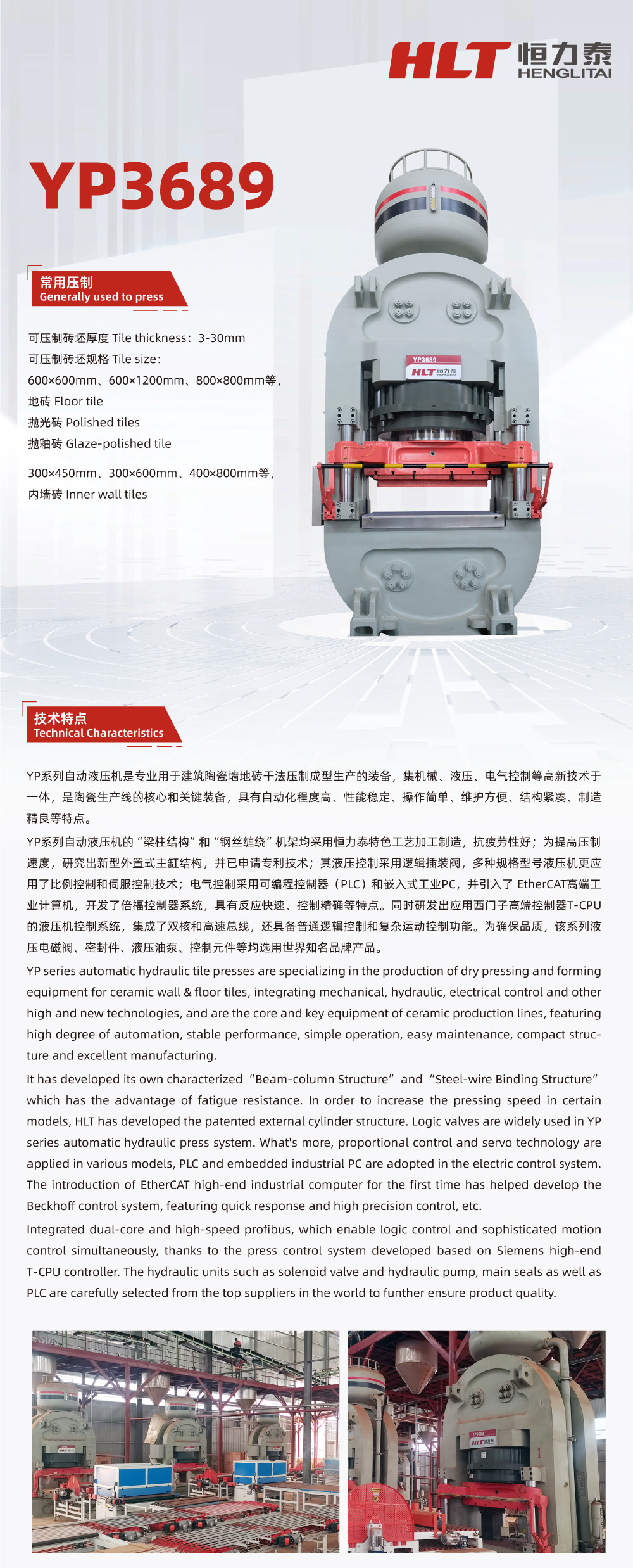 YP series automatic hydraulic tile presses are specializing in the production of dry pressing and forming equipment for ceramic wall & floor tiles, integrating mechanical, hydraulic, electrical control and other high and new technologies, and are the core and key equipment of ceramic production lines.