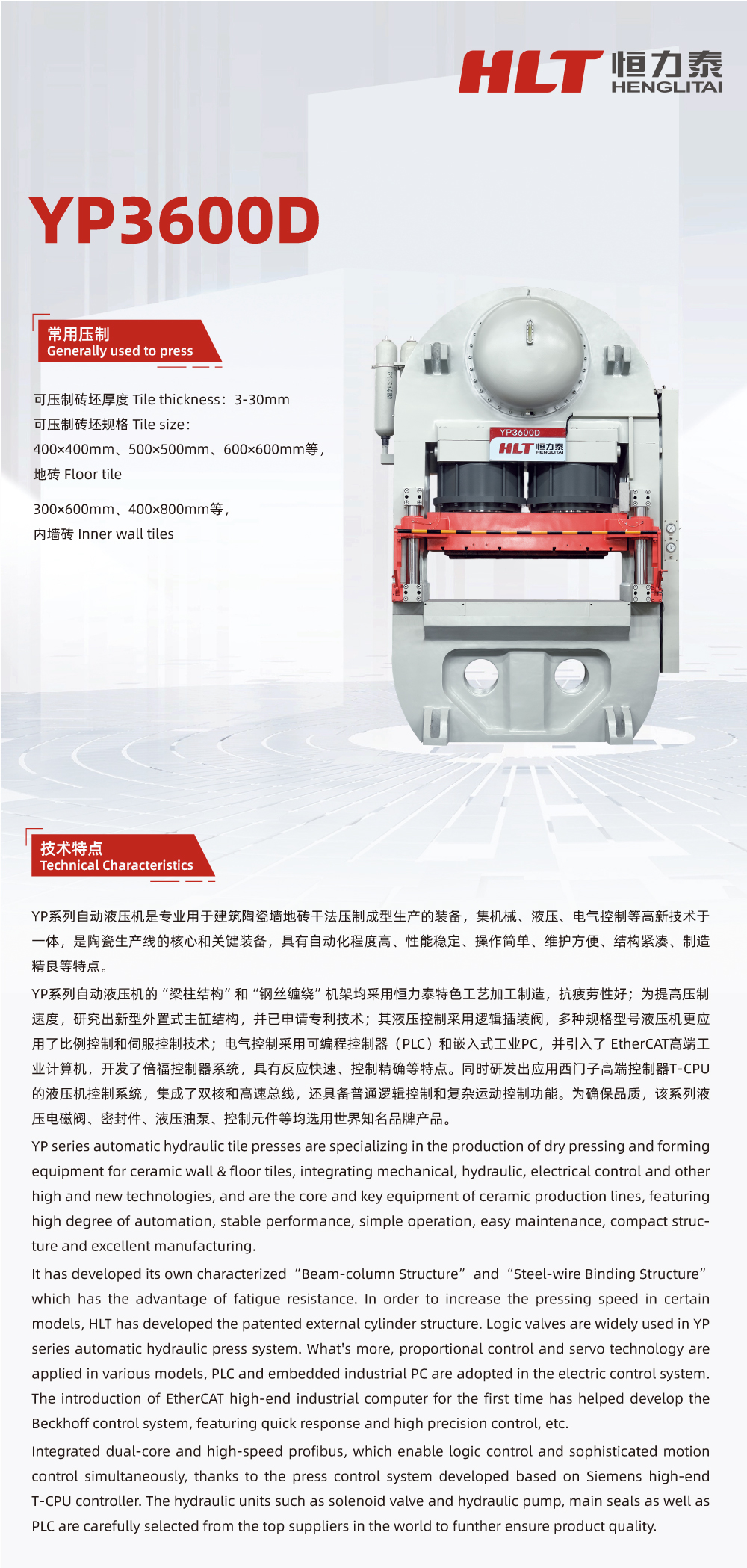 YP series automatic hydraulic tile presses are specializing in the production of dry pressing and forming equipment for ceramic wall & floor tiles, integrating mechanical, hydraulic, electrical control and other high and new technologies, and are the core and key equipment of ceramic production lines.