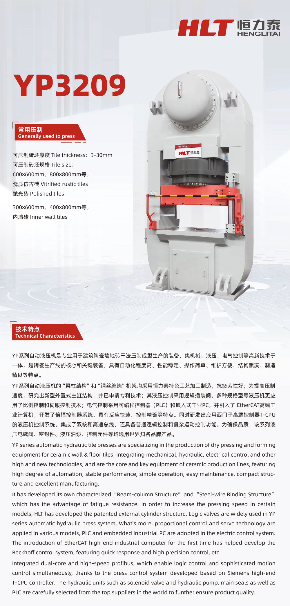 YP series automatic hydraulic tile presses are specializing in the production of dry pressing and forming equipment for ceramic wall & floor tiles, integrating mechanical, hydraulic, electrical control and other high and new technologies, and are the core and key equipment of ceramic production lines.
