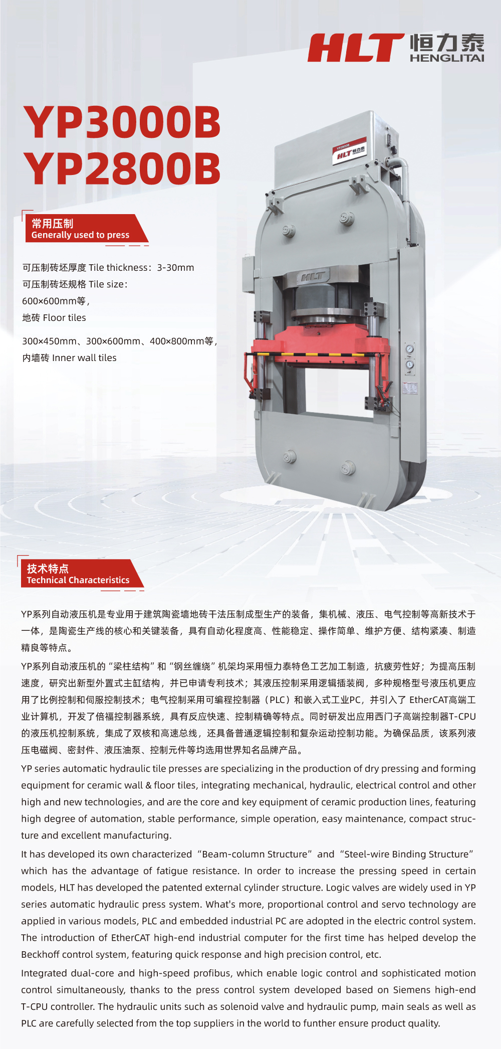 YP series automatic hydraulic tile presses are specializing in the production of dry pressing and forming equipment for ceramic wall & floor tiles, integrating mechanical, hydraulic, electrical control and other high and new technologies, and are the core and key equipment of ceramic production lines.