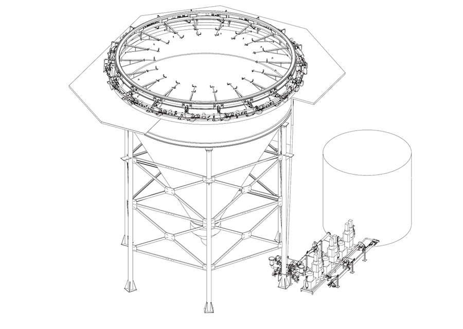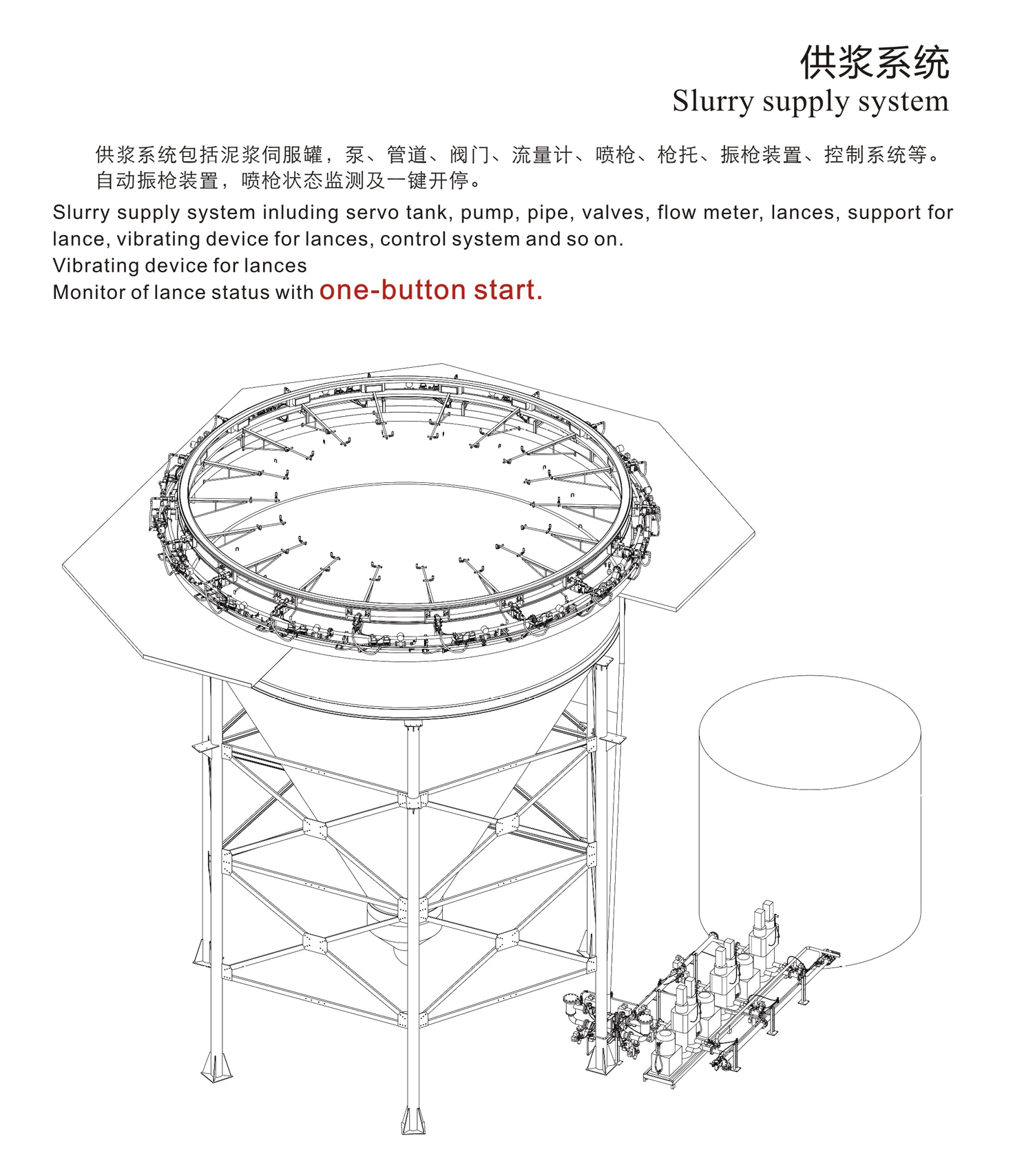 Slurry supply system including servo tank, pump, pipe, valves, flow meter, lances, support for lance,vibrating device for lances, control system and so on.