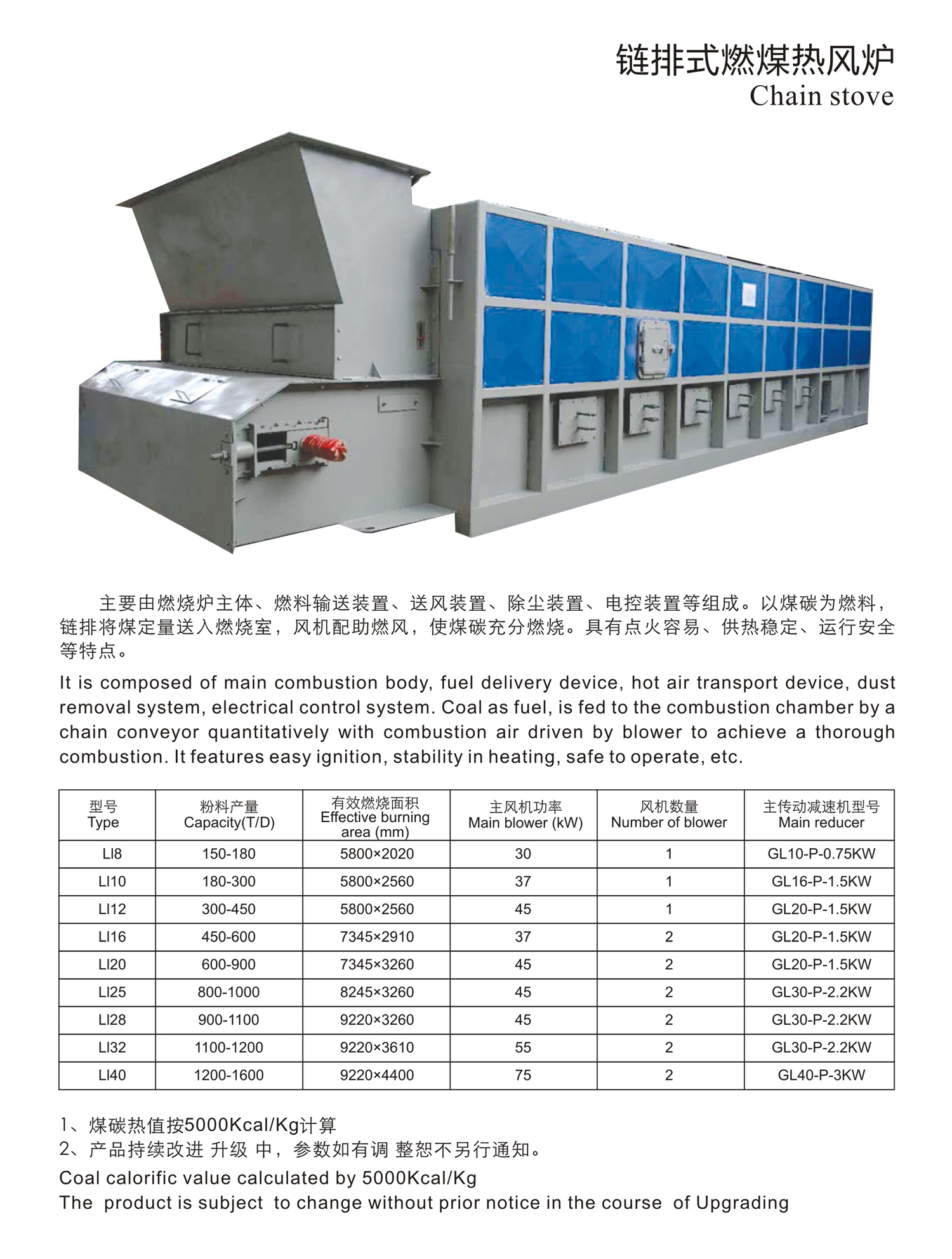 Coal as fuel, is fed to the combustion chamber by a chain conveyor quantitatively with combustion air driven by blower to achieve a thorough combustion. It features easy ignition, stability in heating, safe to operate, etc.