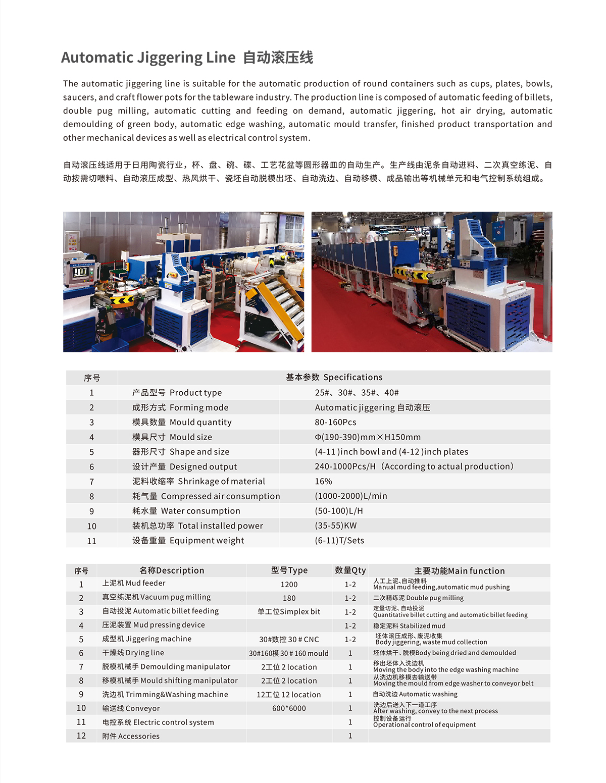 The automatic jiggering line is suitable for the automatic production of round containers such as cups, plates, bowls, saucers, and craft flower pots for the tableware industry. The production line is composed of automatic feeding of billets, double pug milling, automatic cutting and feeding on demand, automatic jiggering, hot air drying, automatic demoulding of green body, automatic edge washing, automatic mould transfer, finished product transportation and other mechanical devices as well as electrical control system.