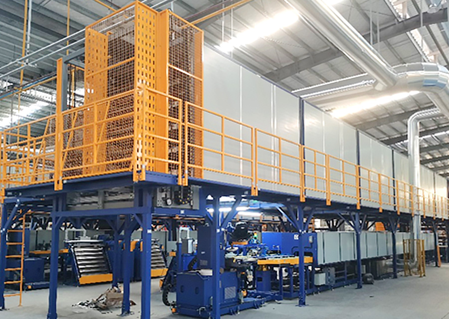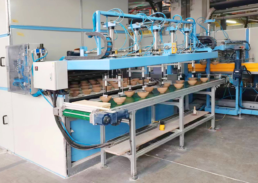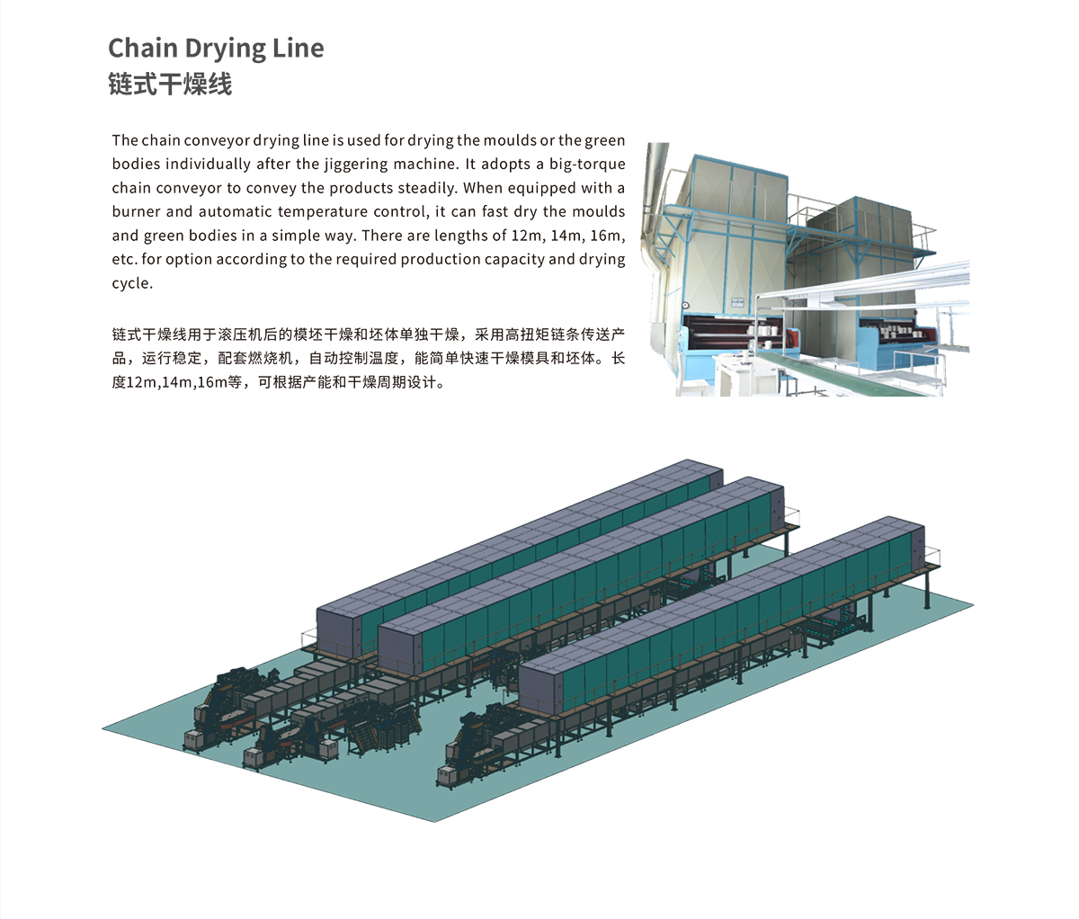 The chain conveyor drying line is used for drying the moulds or the green bodies individually after the jiggering machine. There are lengths of 12m, 14m, 16m, etc. for option according to the required production capacity and drying cycle.
