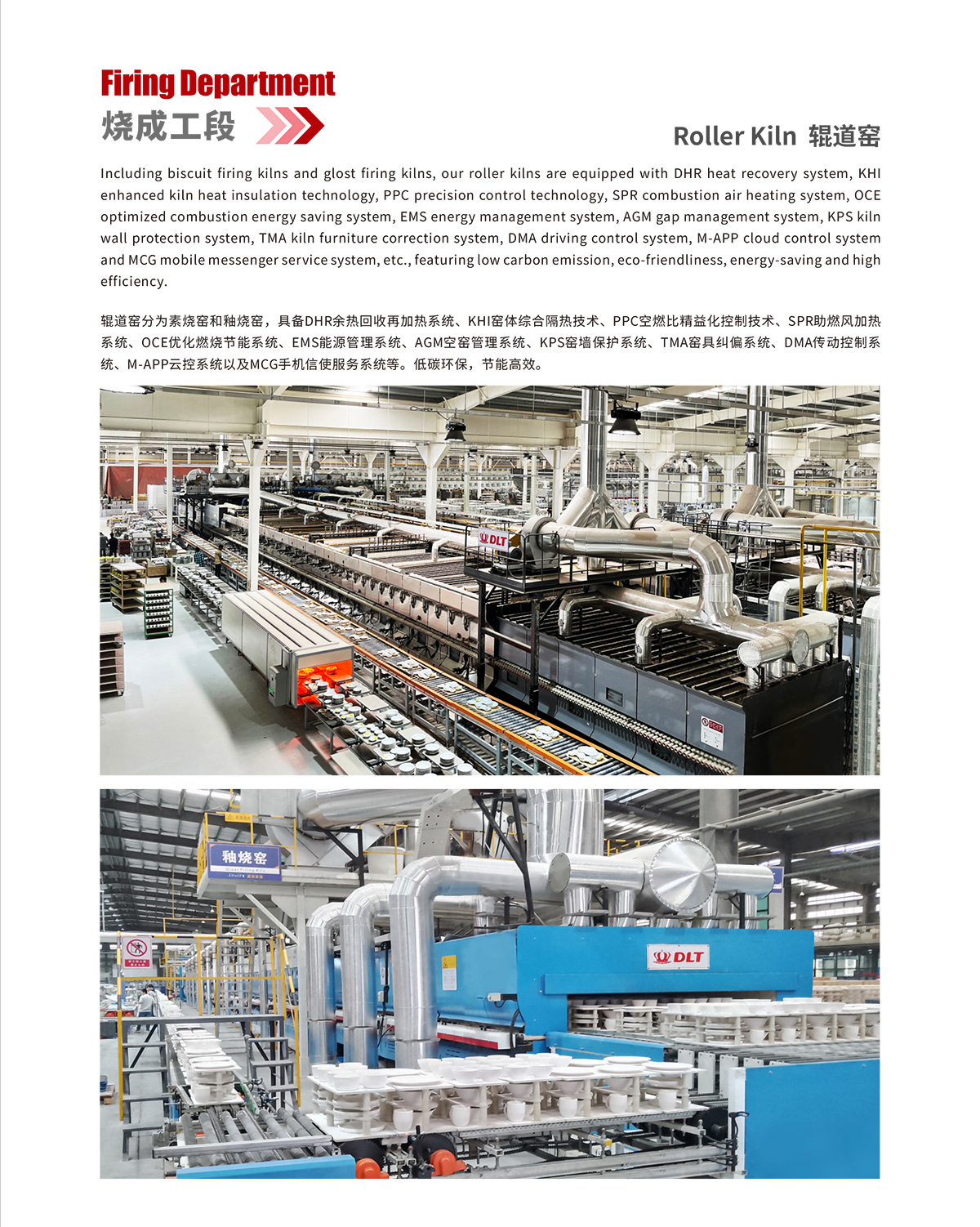 Including biscuit firing kilns and glost firing kilns, our roller kilns are equipped with DHR heat recovery system, KHI enhanced kiln heat insulation technology, PPC precision control technology, SPR combustion air heating system, OCE optimized combustion energy saving system, EMS energy management system, AGM gap management system, KPS kiln wall protection system, TMA kiln furniture correction system, DMA driving control system, M-APP cloud control system and MCG mobile messenger service system, etc., featuring low carbon emission, eco-friendliness, energy-saving and high efficiency.