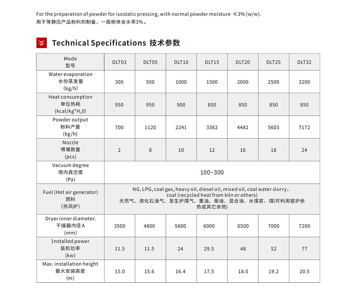 For the preparation of powder for isostatic pressing, with normal powder moisture≤3% (w/w). It is mainly composed by main body,hot air piping systems,ventilation system