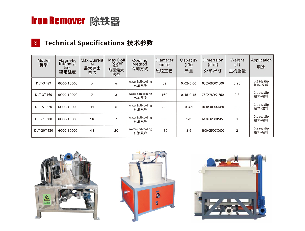 This equipment is mainly used to remove the iron powder, granular and bulk material in the slurry. There are two series of per-manent magnet and electromagnetic type. The type of iron remover can be selected according to users requirements.