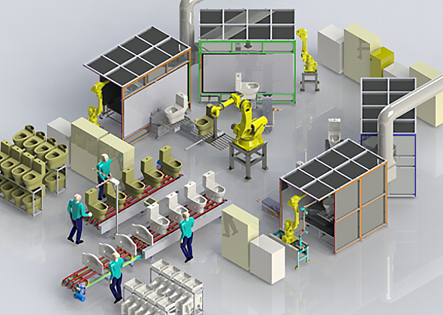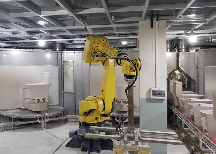 机器人施釉由机器人、自动旋转台、供釉系统、喷枪系统、照明及除尘设施组成,机器人能很好的控制喷涂时间和质量,产品釉面均匀,一致性高。机器人施釉分单柜模式和工作站模式,可以单台或多台组合施釉。
