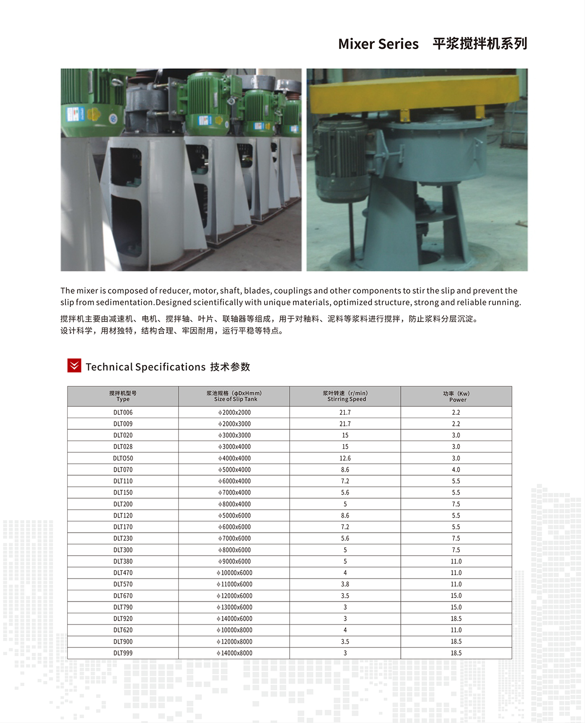 The mixer is composed of reducer, motor, shaft, blades, couplings and other components to stir the slip and prevent the slip from sedimentation.