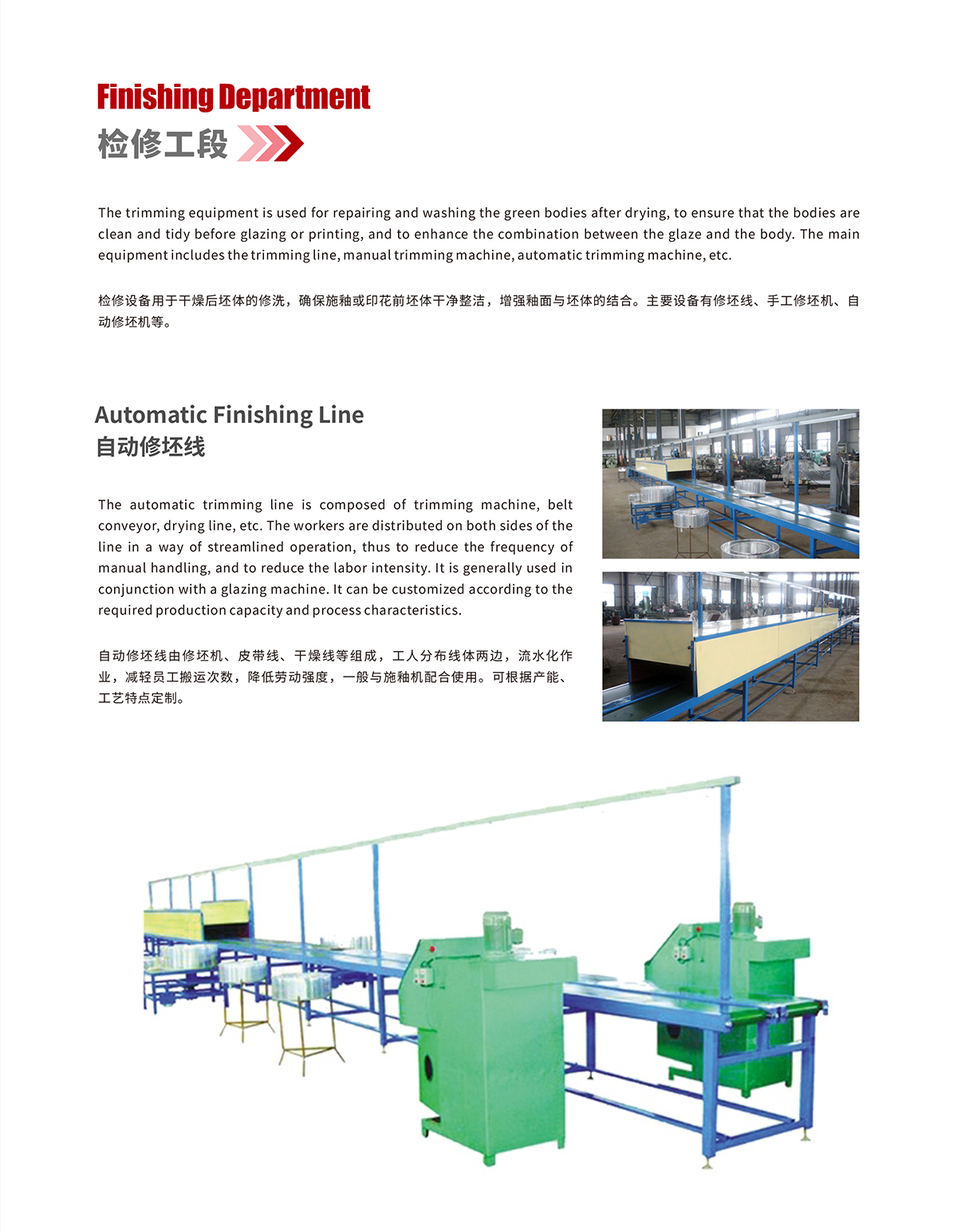 The automatic trimming line is composed of trimming machine, belt conveyor, drying line, etc.