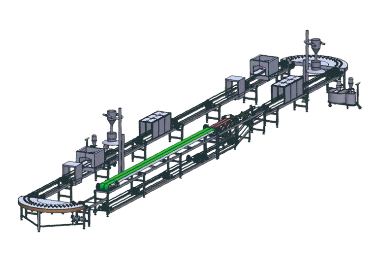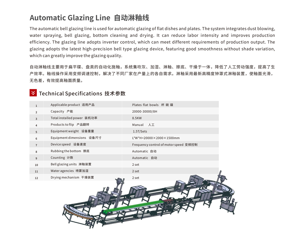 The automatic bell glazing line is used for automatic glazing of flat dishes and plates. The system integrates dust blowing, water spraying, bell glazing, bottom cleaning and drying.