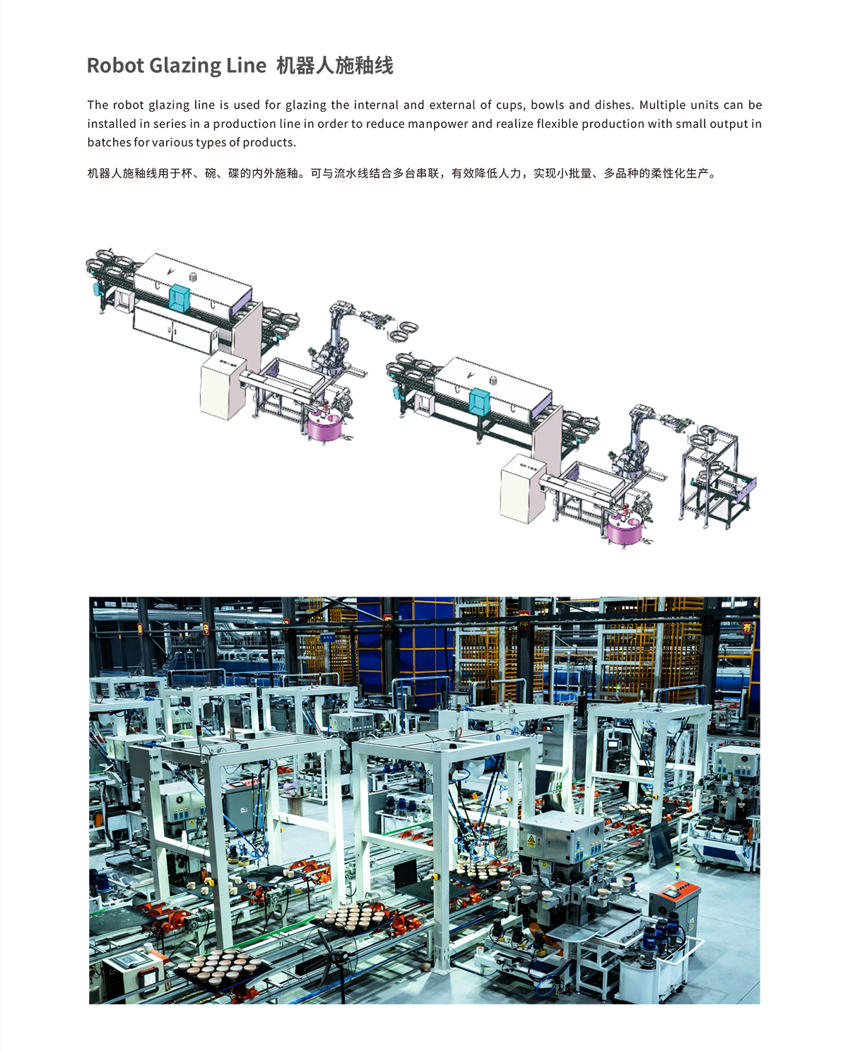 The robot glazing line is used for glazing the internal and external of cups, bowls and dishes.
